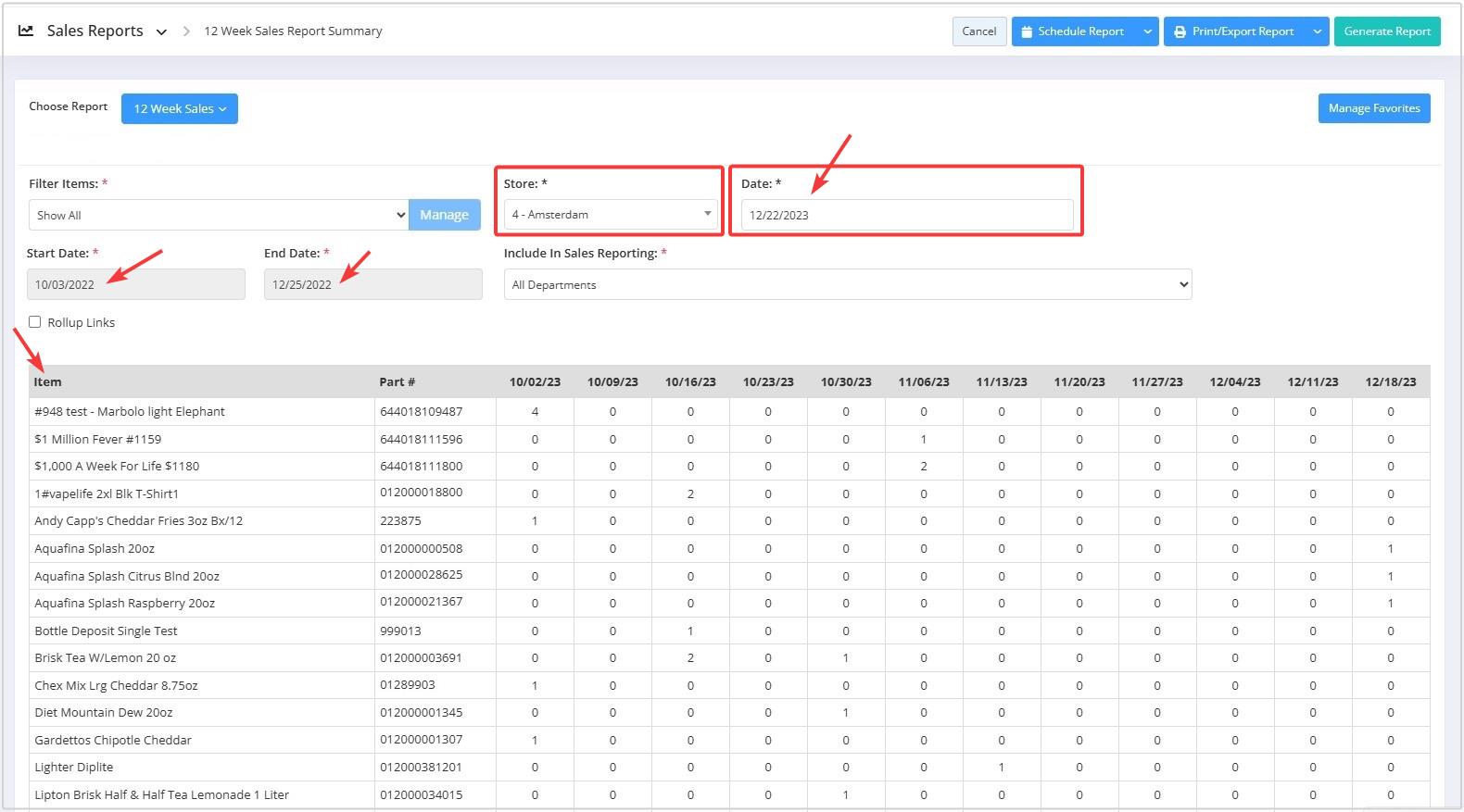 The "12 Week Sales Report" will display the sales data of the products only that were sold in the previous 12 weeks from the date entered in the field labeled Date.