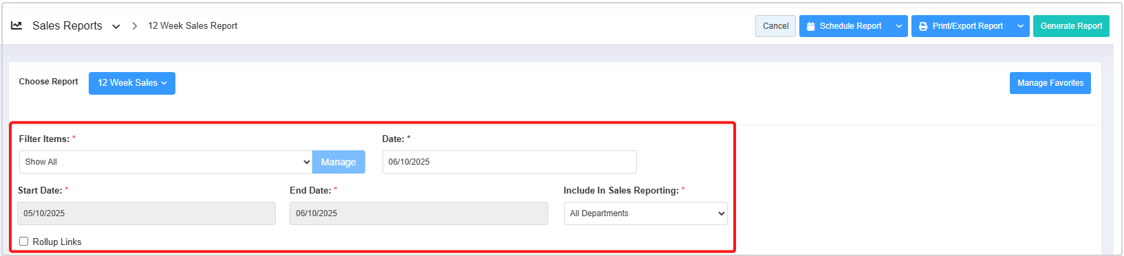 FTx Cloud POS lets you view the "12 Week Sales Report" records according to your preferences using various filter options. You can configure the report with any single filter or combination of multiple filters, highlighted in Figure 3.1.
