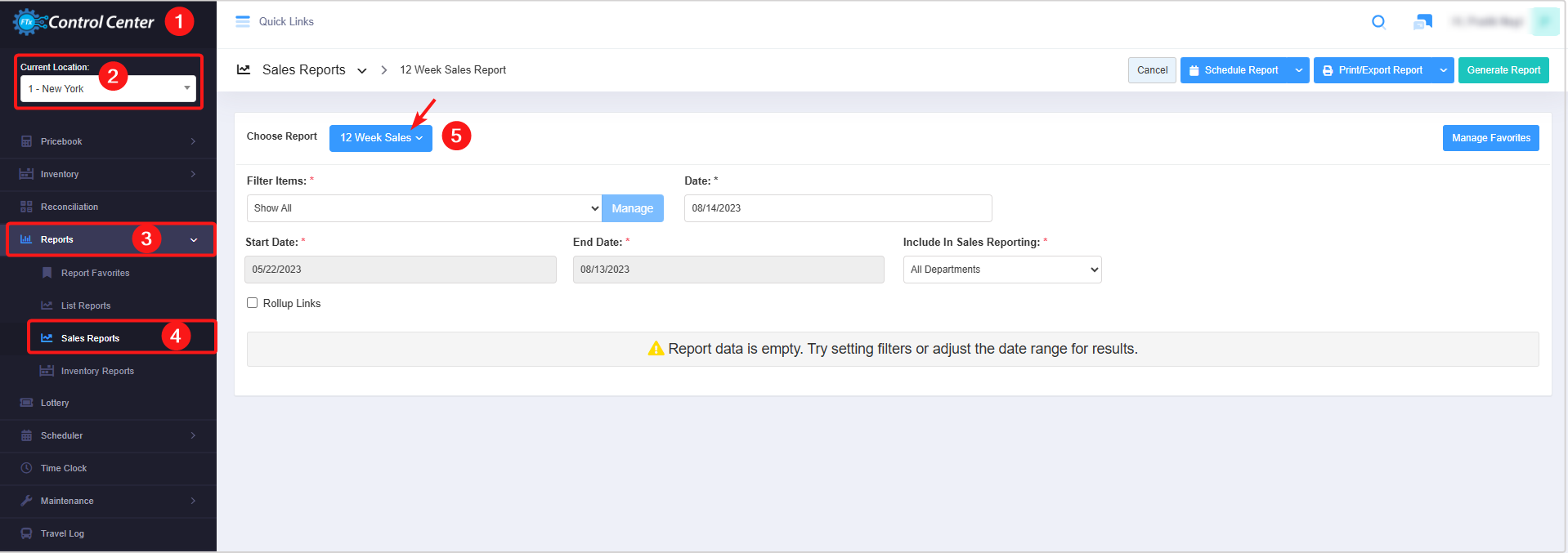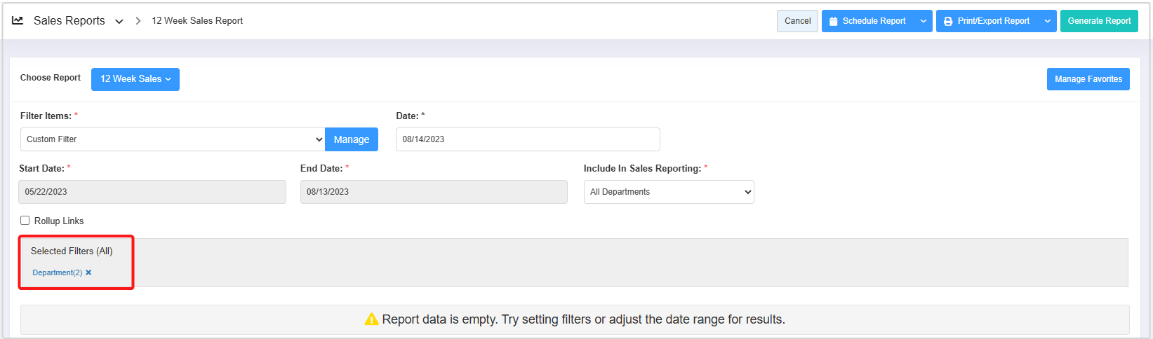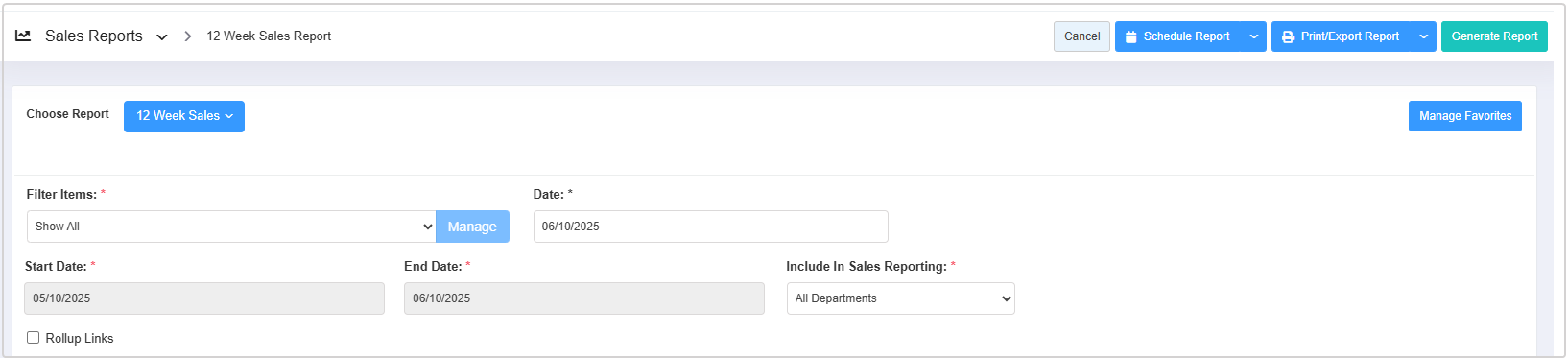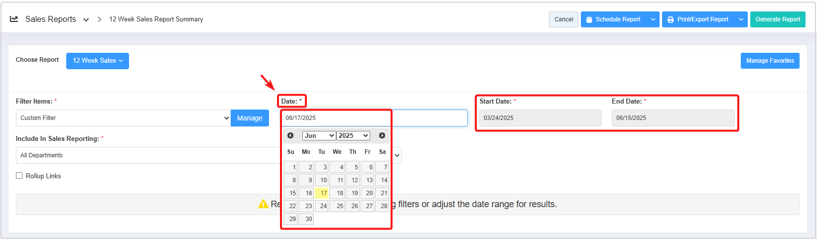 - Select the date range and click "Generate Report" to view the 12 Week Sales Report for that date range. When you select a date in the Date field, the system considers the last full 12 weeks from that date and automatically populates the Start Date and End Date fields with the corresponding dates. Section 3.2 Date explains more about
