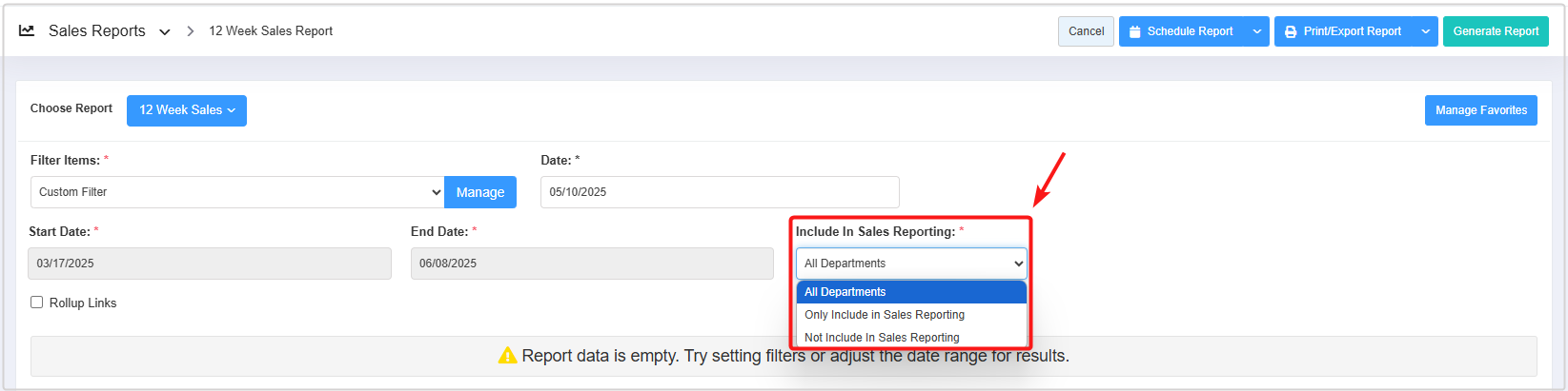 The Include In Sales Reporting drop-down allows you to filter the report records based on three parameters: All Departments, Only Include in Sales Reporting, and Not Include in Sales Reporting.
