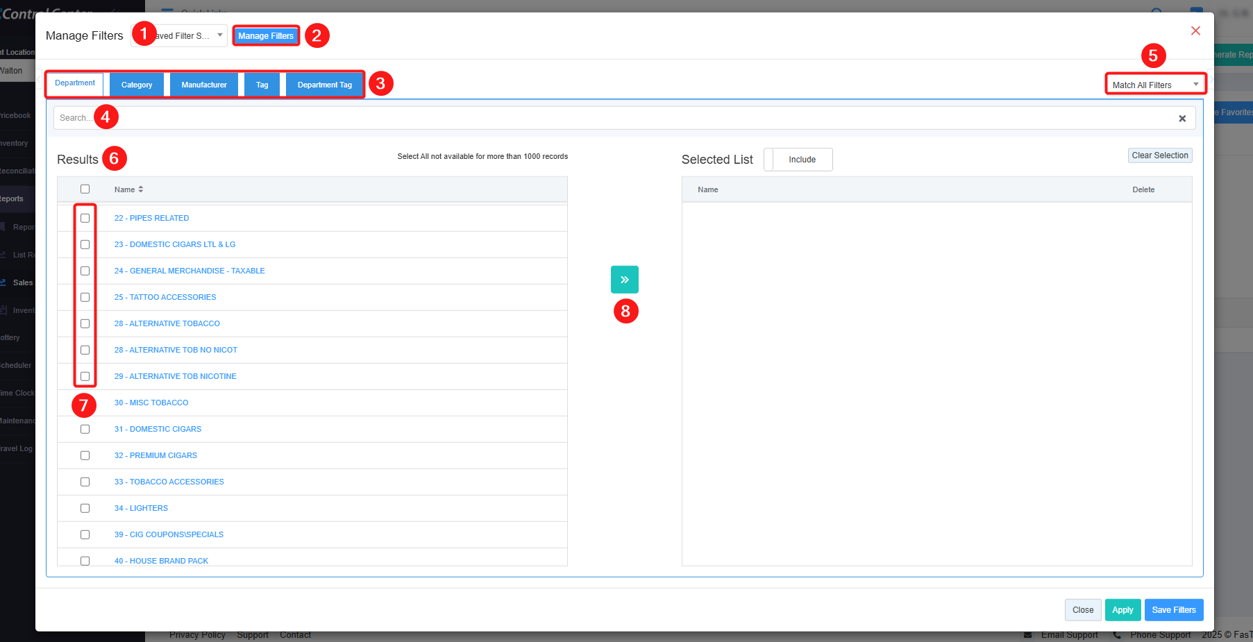 - 5: Match All Filters Drop-Down: This filter has two options, "Match All Filters" and "Match Any Filters." Select either option to determine whether the Manage Filters screen data matches all applied filters. This drop-down is useful when you use multiple parameter tabs. For example, you choose a few manufacturers from the "Manufacturer" tab and a few departments from the "Department" tab.