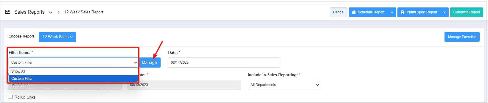 - 1: Saved Filters Drop-Down: Select the saved custom filters from the Manage Filters drop-down (if any) and click "Apply" to apply the saved custom filter. The system will redirect you to the 12 Week Sales Report home screen. Click "Generate Report" to generate the report for the selected filter.