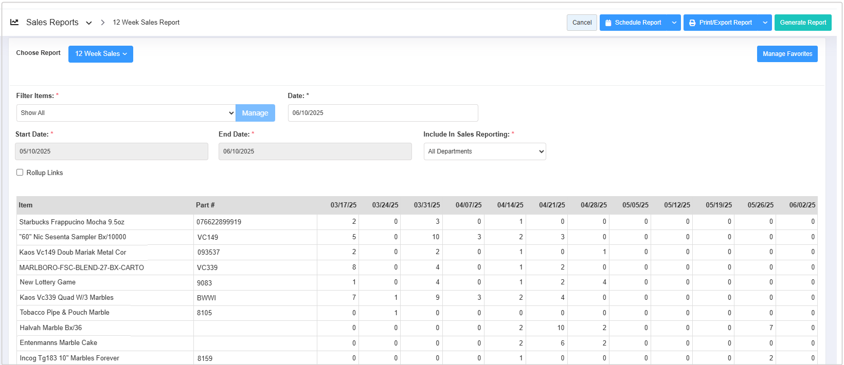 - 12 Week Sales Columns: The 12 columns in the 12 Week Sales Report display the units sold during the week.