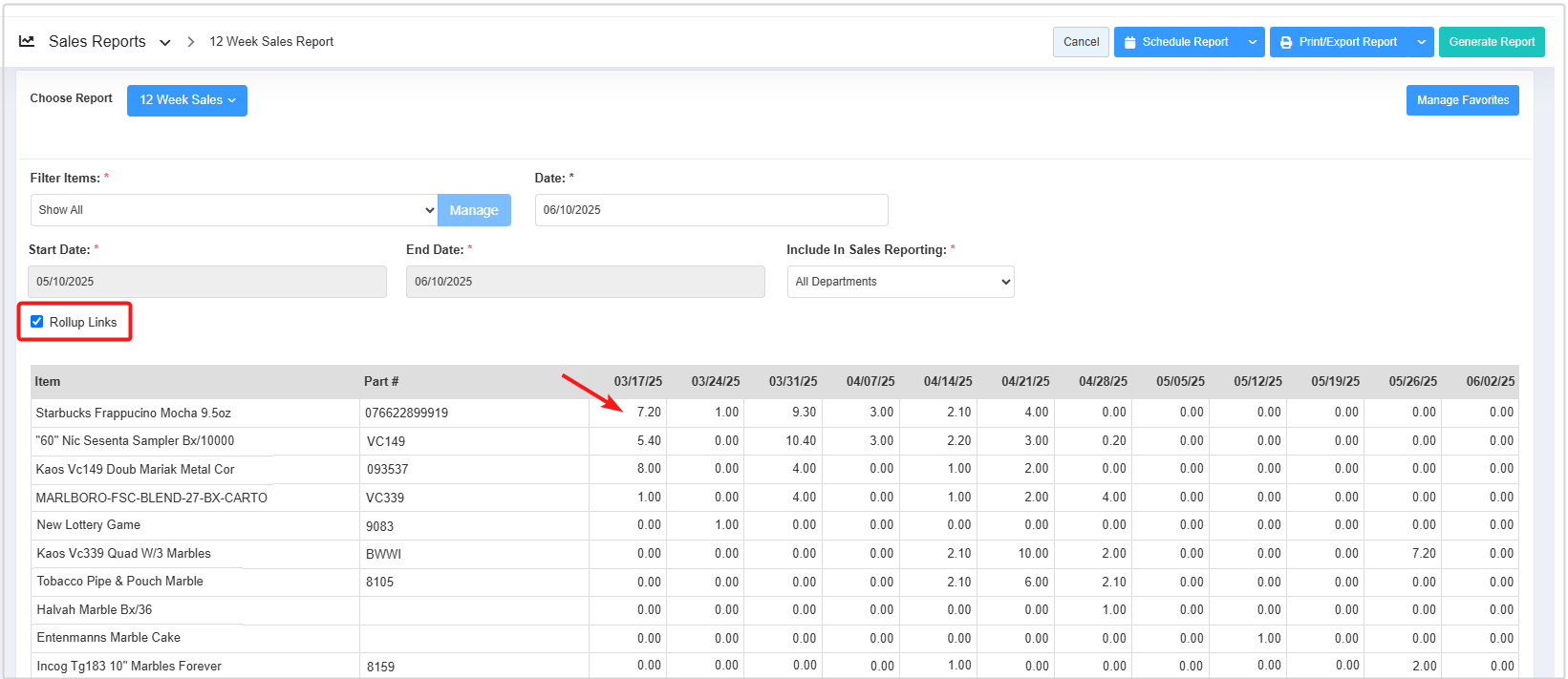 - Rollup Links: If you tick this checkbox and generate the report, the system will roll up the parent item and the child item's quantity and show them in the same row, as Figure 3.2 shows.