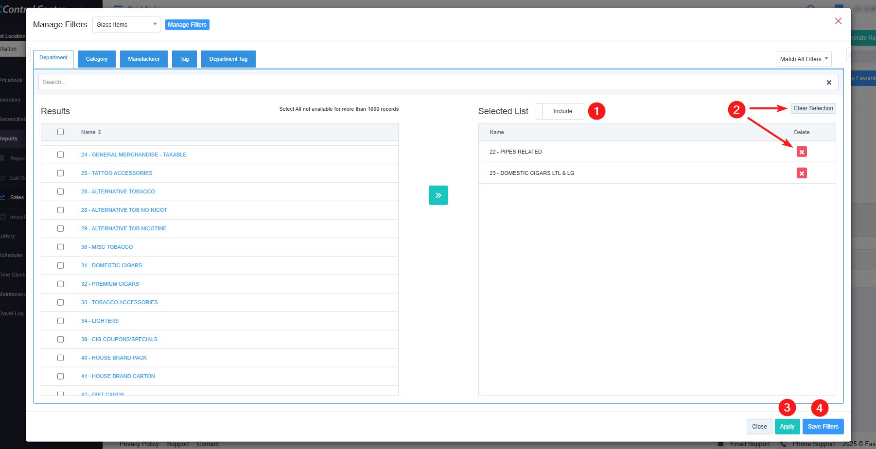 - 3: Parameters Tabs: You will see five tabs: Department, Category, Manufacturer, Tag, and Department Tag. Select the required tab, i.e., "Department," to create or apply a custom filter specific to the selected departments.