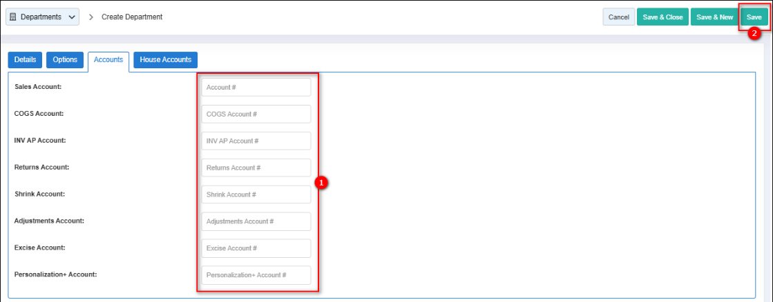 - Personalization+ Account: This column displays the account number assigned for personalization-related transactions within that department. If populated, it indicates that personalization charges will be posted to that account. If blank, it indicates that no personalization-specific account mapping has been configured.