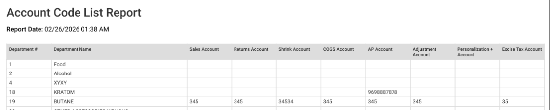 - Shrink Account: This column displays the shrink account number assigned to each department. If a value is present, it indicates that shrink transactions for that department will post to that account. If blank, it indicates no shrink account has been configured for that department.