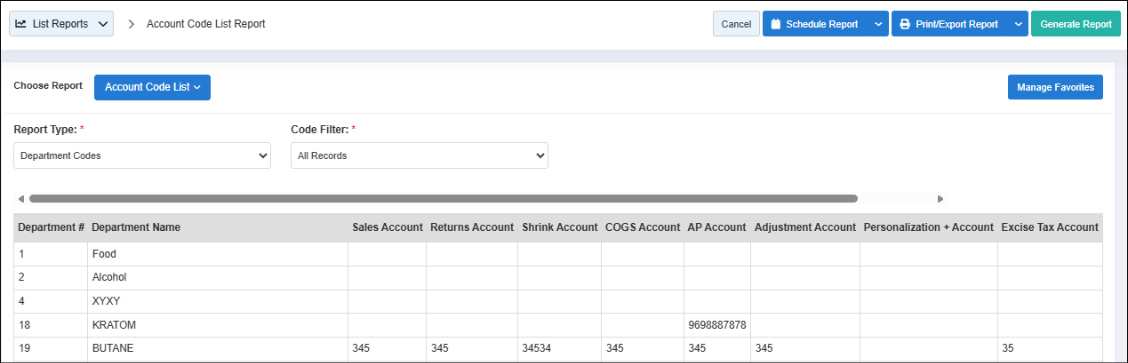 - Account Missing Codes: Displays only those department records where the required account code fields are not configured or left blank.