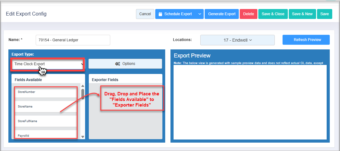 4. Exporter Fields Panel: This panel is where the user places the fields that will be part of the final export. Users drag fields from “Fields Available” into this panel to build the export format.