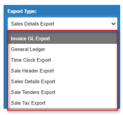 - Export Type: Export Type defines the specific category of data (such as sales, tax, tenders, or time clock) that will be exported from the system.