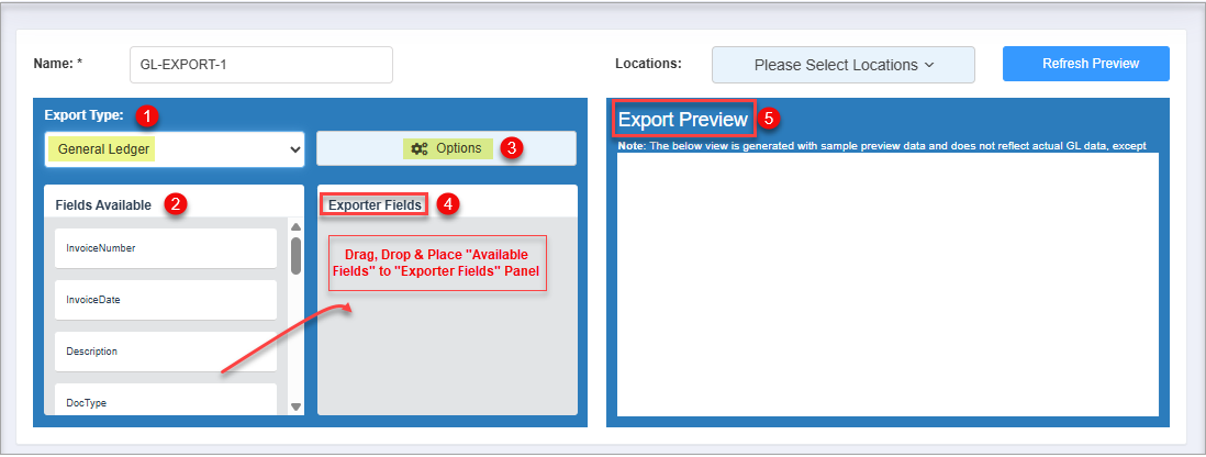 5. Export Preview Panel: This section shows a sample preview of how the export file will look once generated. It displays a mock preview based on the configured fields before downloading or generating the real export.