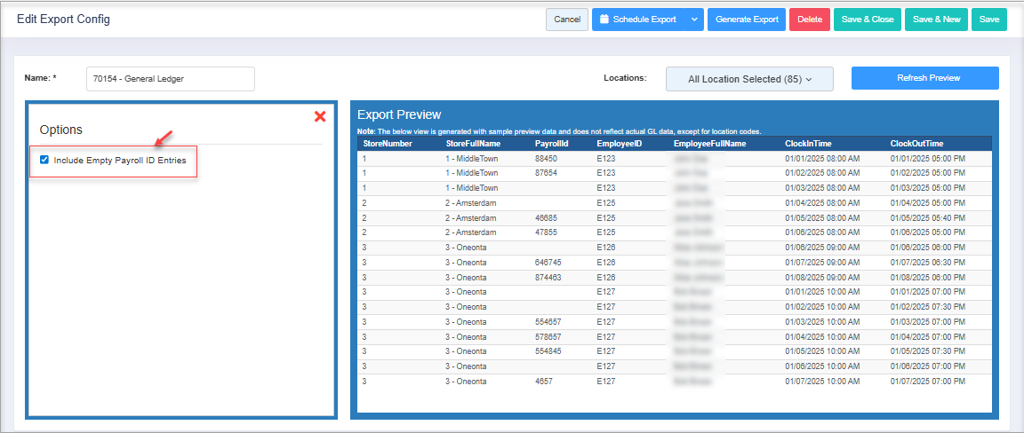 - Enabled: Time clock entries without a Payroll ID are included in the export.