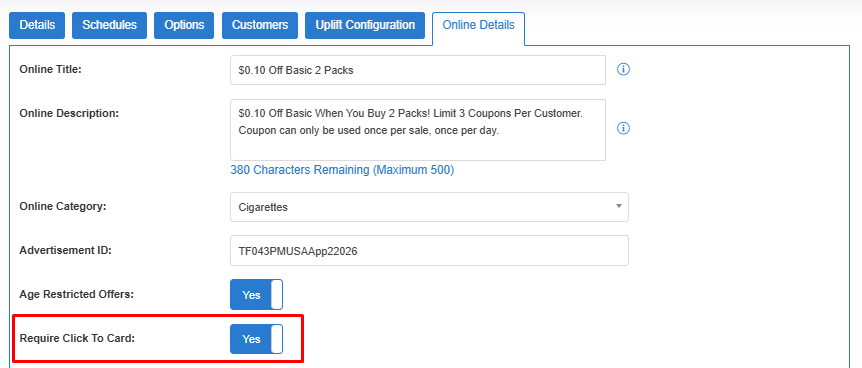 This field allows the discount to fire at the register only once the deal has been clicked and acknowledged (Click to Card) on the app. This only works currently when the customer type is set to Dynamic. You do not need this for any of the base Loyalty Fund offers.
