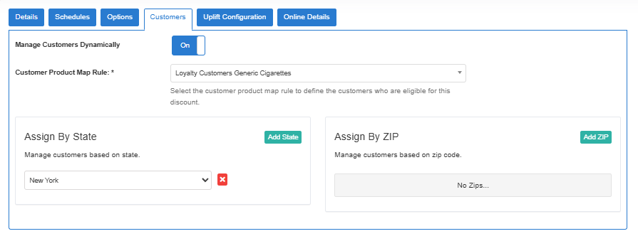 Once added, the POS should reach out to the back office (ControlCenter) and check if the customer is in the list when their loyalty is loaded in the register. If the customer is valid and matches by state/zip and map rule, they will return back a valid response and the POS will proceed to apply the discounts as long as the other criteria of the discount is met and their basket matches.