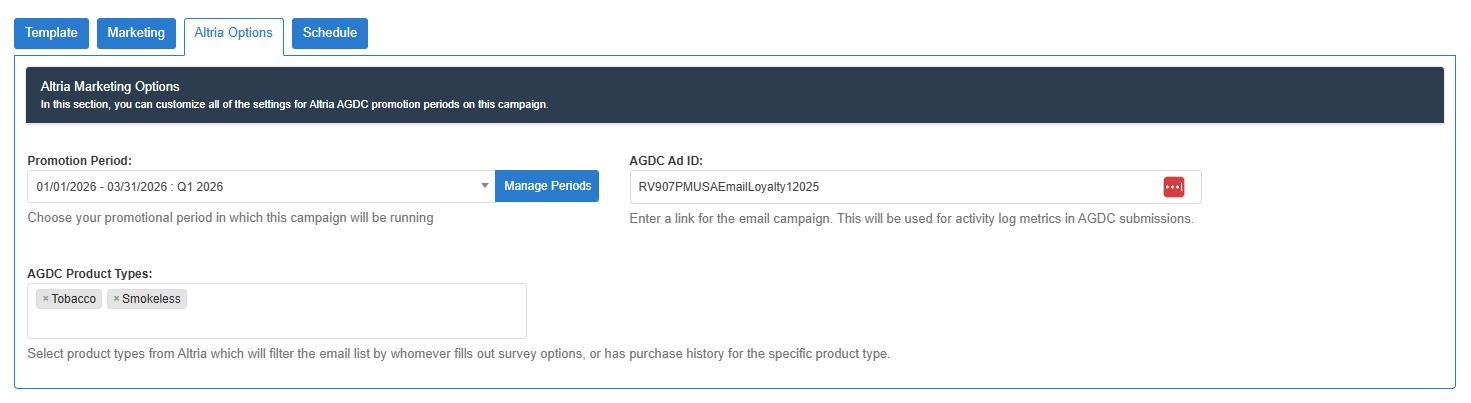 Used to designate the quarter or promotion period the email is part of. For example you'd create or use a promotion period Q1 2026, from 01/01/2026 - 03/31/2026 to associate the email campaign with for any Q1 2026 promotions being sent.