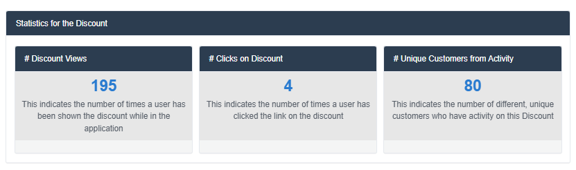 You can also view the current stats of how many views and clicks the discount has had, as well as the number of unique customers who've seen the deal online. This is useful information to see traffic, but also these same numbers should be sent into the activity log as well. The numbers below show as a lifetime figure, and the activity log is a per-month report, so the numbers should match lifetime but not necessarily for the current month.