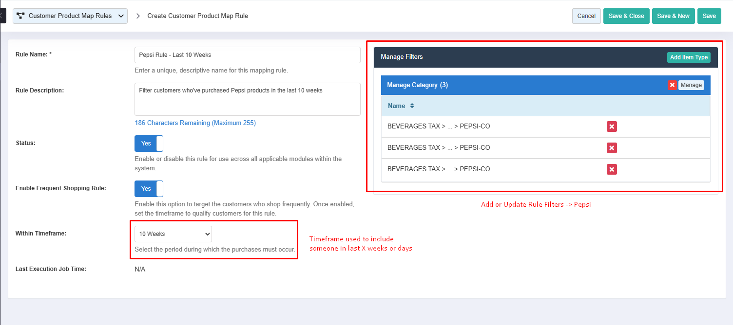 If you want the rule to process only customers who have purchased in the last X weeks or days, enable the field Enable Frequent Shopping Rule and use the field Within Timeframe to control this by choosing an option from the dropdown. This will still map all customers to the list regardless of their last purchase timestamp, but it will store the last purchase timestamp as well, which allows us to filter down to customers who have a date range matching the selected option. Changing this field does not mean the list needs to regenerate, as the date works off the saved dates in the mapping and simply changes the filter when its applied.