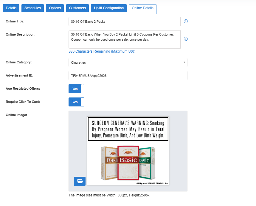 This field puts the promotion into the 21+ Offers section of the Deals page. Enable this for any Altria promotion. You can optionally upload non-age-restricted promotions like Pepsi on your deals page, if not being used for an Altria promotion.