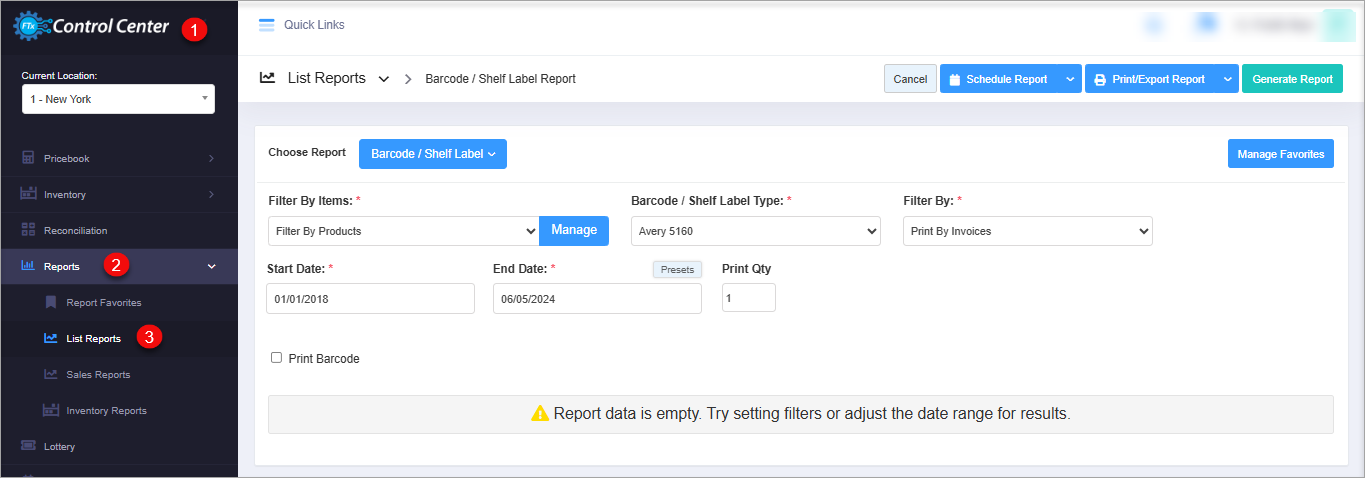 - The system will navigate you to the Barcode/Shelf Label Report home screen. Click "Generate Report." The system will generate reports based on your selection as highlighted in Figure 4.5.