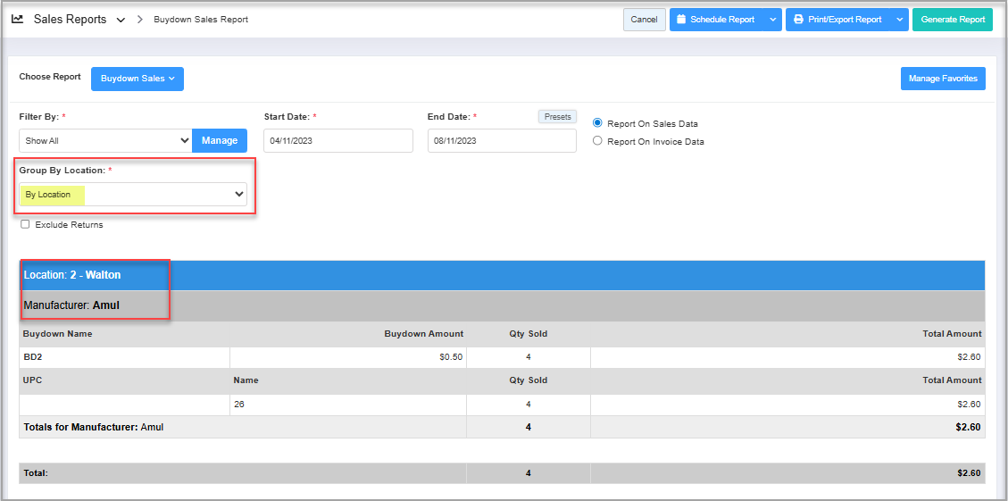 - Buydown Sales Report when Grouped by Location for Show Details is displayed as follows: