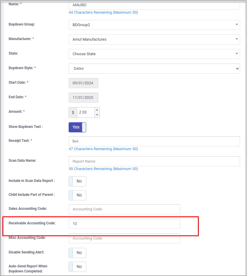 The Receivable Code is a unique accounting identifier provided by the manufacturer. It is used in accounting systems to ensure that buydown funds are accurately recorded, tracked, and reconciled in both the retailer’s and the manufacturer’s systems. It is defined while creating buydowns.