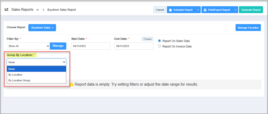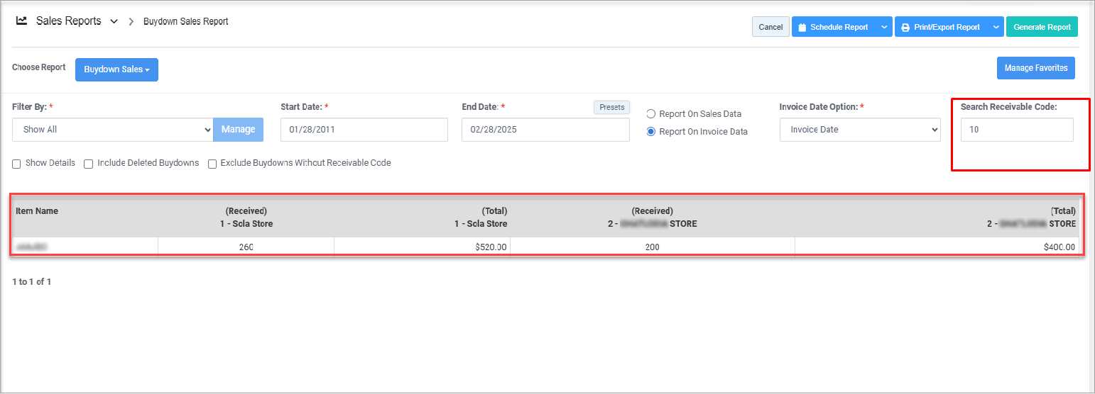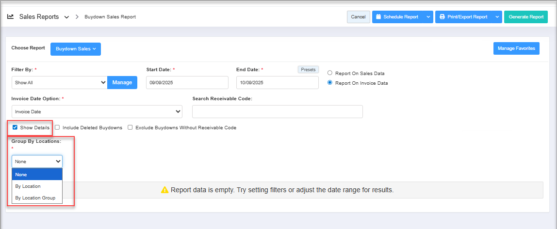 Use "Report On Invoice Data" to view the buydown details based on the invoice data. By default, the system selects "Report On Sales Data," displaying the buydown data according to your stores' sales.