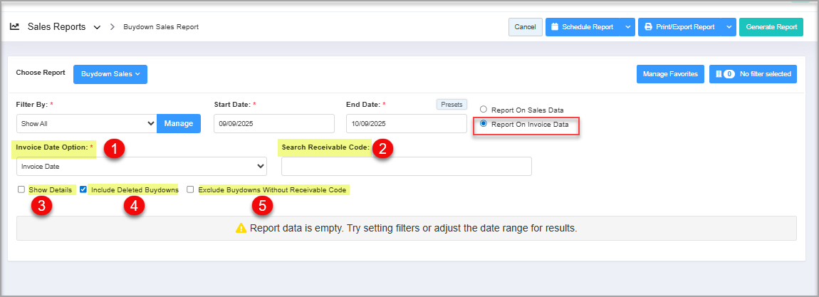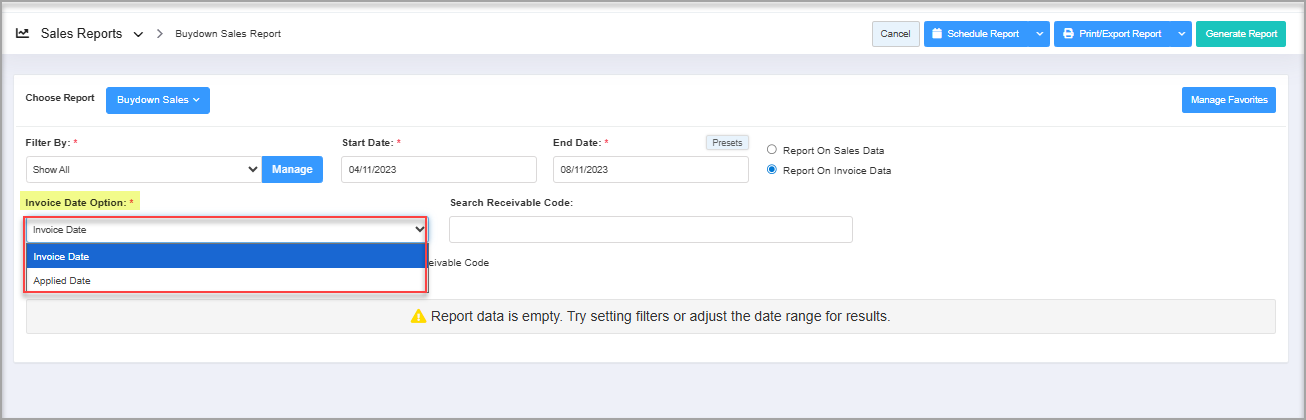 - Report On Invoice Data: This filter lets you view the buydown details based on the invoice data. The system will enable other fields and checkbox filters when you select this option. Point 4. Report On Invoice Data explains the further details.