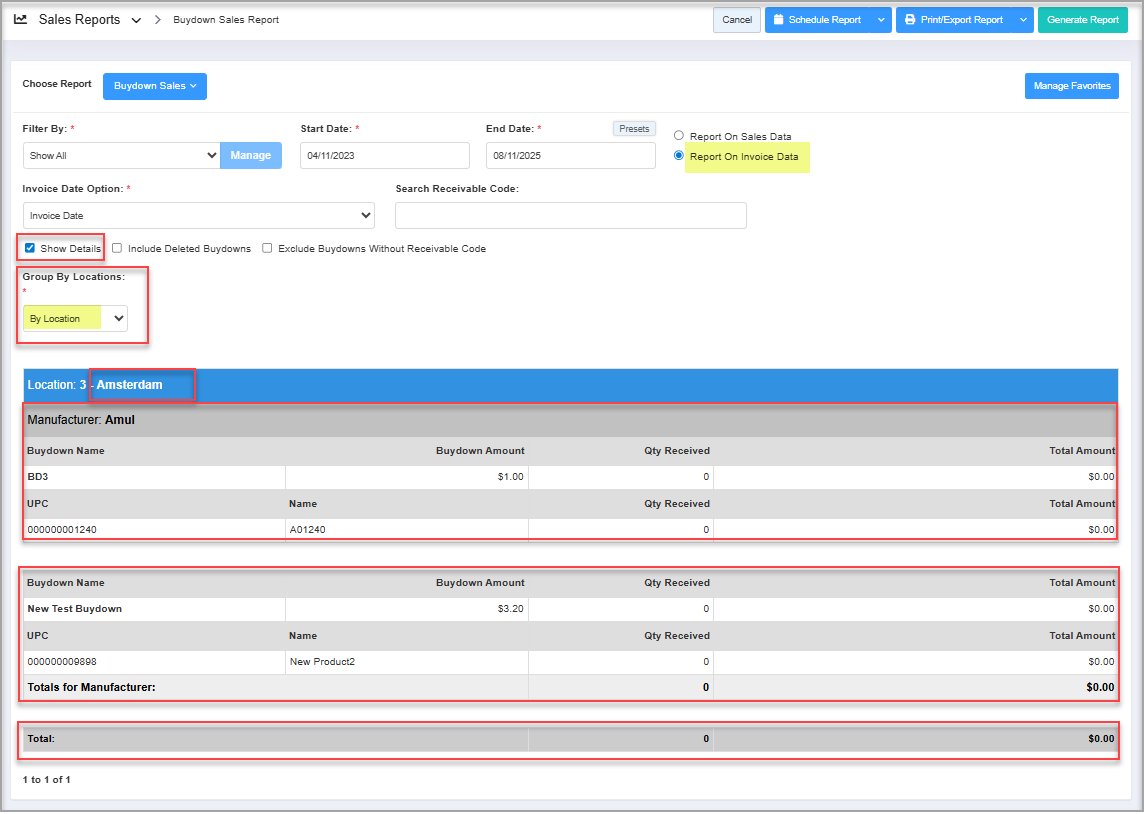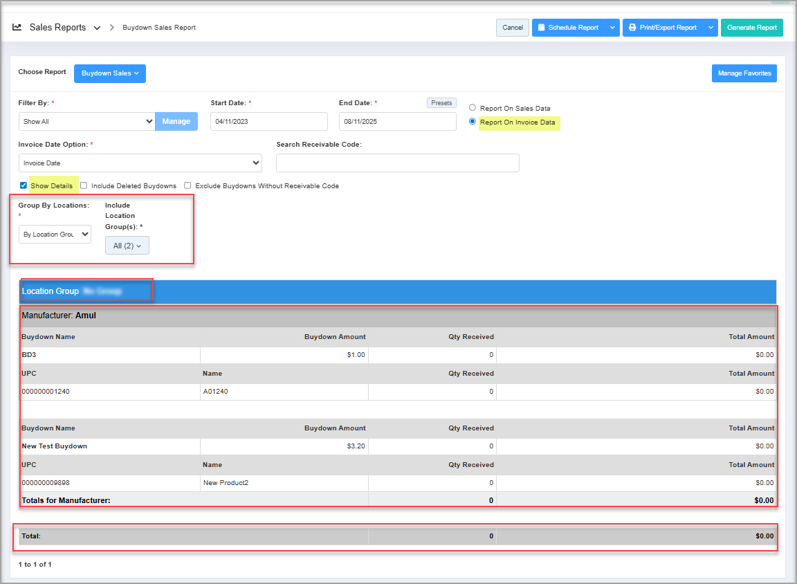 Figure 3.4.1.33. Show Details: The Show Details filter displays manufacturer-wise buydown details for received products, including quantities and total buydown amounts. Group By Location option becomes available for the "Show Details" checkbox filter , allowing you to group buydowns by location or location group.