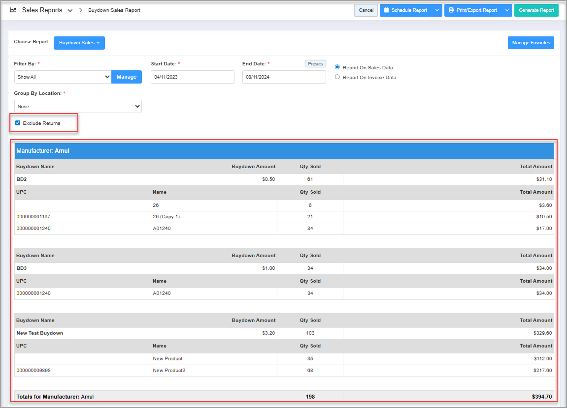Return items are indicated negatively in the Qty Sold column. Selecting the "Exclude Returns" checkbox will remove those entries from the Buydown Sales Report.