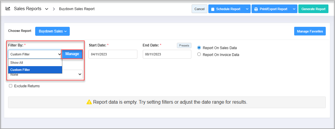 - Custom Filter: This option enables you to select specific parameters such as UPC, Manufacturer, Buydown, and Vendor to generate the Buydown Sales Report. Once you select "Custom Filter," the system will enable the "Manage" button to set up the filters.