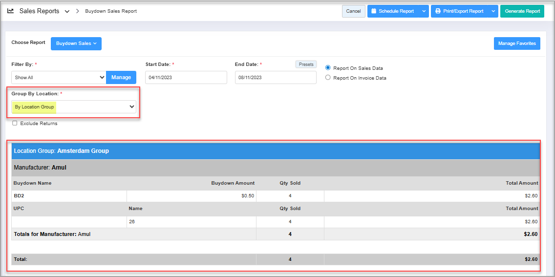 - Buydown Sales Report when Grouped by Location Group for Show Details is displayed as follows: