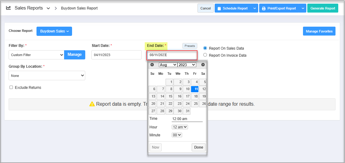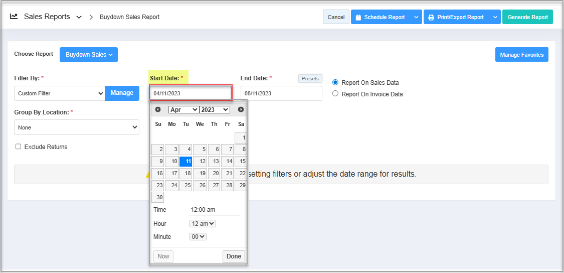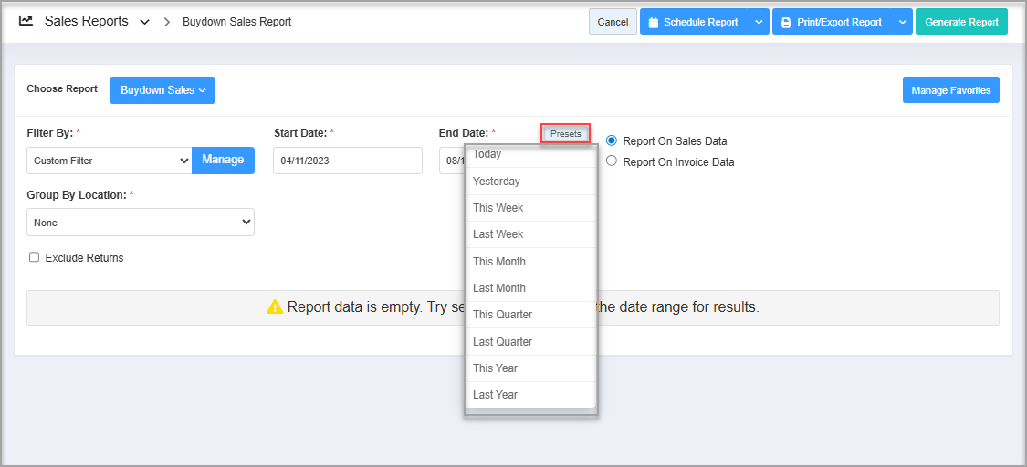 - Navigate to the Buydown Sales Report screen.
