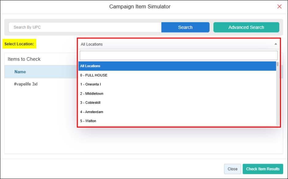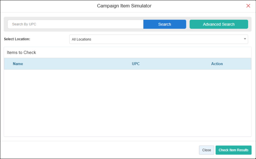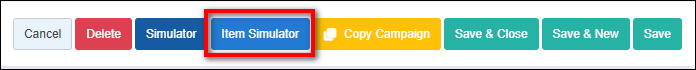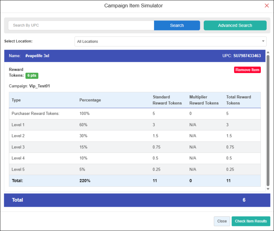 The Campaign Item Simulator allows users to validate how specific products will behave within a campaign. It provides a detailed breakdown of reward calculations based on selected items and locations.