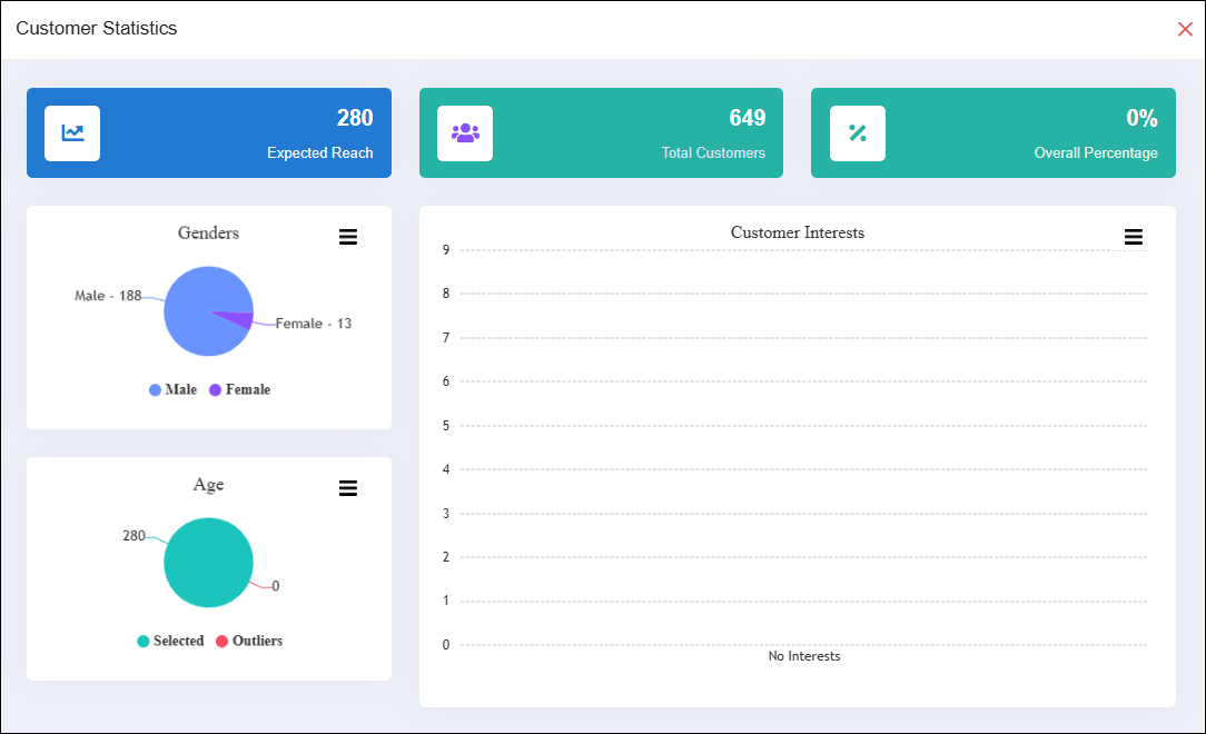 The Customer Statistics window helps you validate your campaign audience by providing a clear view of reach, demographics, and engagement levels, enabling more accurate and effective targeting.