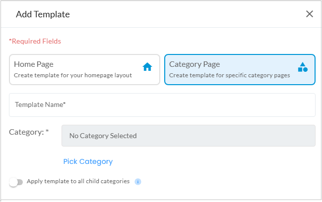 To create a new category banner using predefined widgets, click the ADD TEMPLATE button. This action opens a pop-up where you will get the option "Select Template Type."