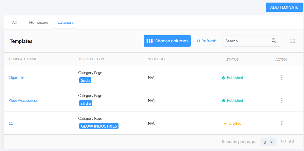 The store admin user will navigate to the "Page Templates” where the list of templates is added along with the assigned location, scheduled time, status, and actions (ellipsis icon).
