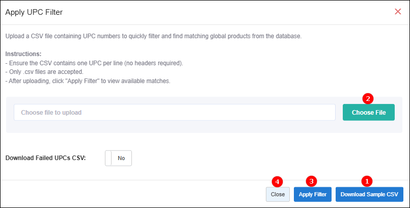 This is another global product filtering method that simplifies bulk product listing by matching the UPCs in your CSV upload with products in the Global Pricebook. It ensures only valid UPCs are displayed, helping you narrow results quickly, improve accuracy, and avoid selection errors.