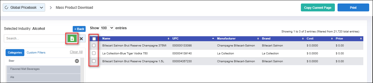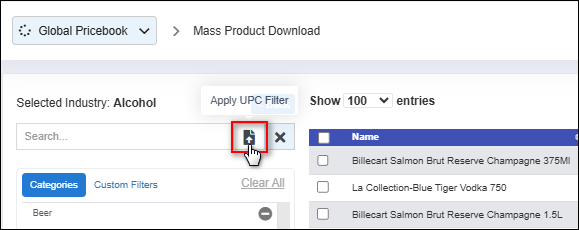 Note: Only upload UPCs from the selected industry (e.g., liquor), as the Global Pricebook will ignore products outside that industry.To learn how to navigate to the Global Pricebook, click here. 1. Applying UPC Filter