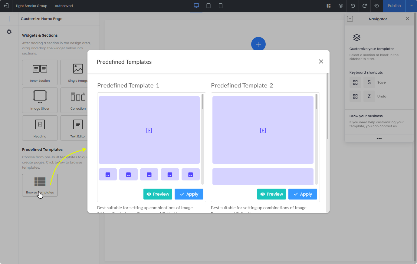 - Preview: The Preview option allows you to view how the selected template will appear on your home page. This helps you review the layout structure, widget positioning, and overall design before making any changes to your existing template.
