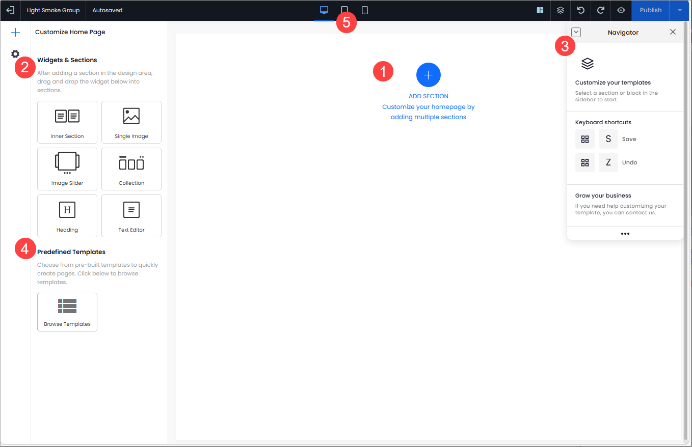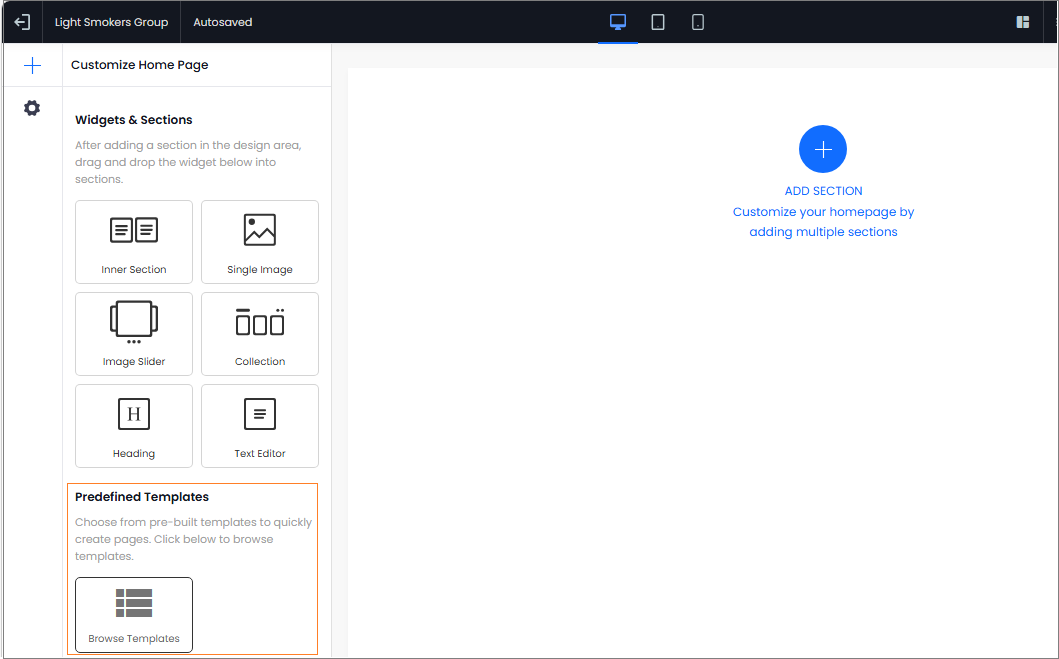 The Design Area offers a variety of widgets and sections to help you create an appealing and user-friendly homepage. You can always add a new section with different Design Layout.