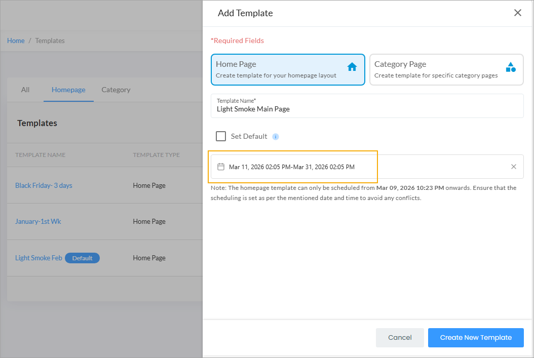 3. Template Schedule: Specify the Start Date and End Date during which the template should remain active. Admin users can schedule the homepage template based on their local system/browser time zone.