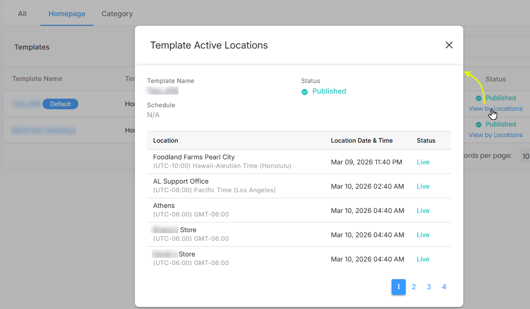 As admin users, when you click on it, you can see the list of the "Template Active Locations" along with the Location Date & Time. So, the view by locations will give the clear visibility to you that customers from which region or store location can currently have the access for this scheduled template.