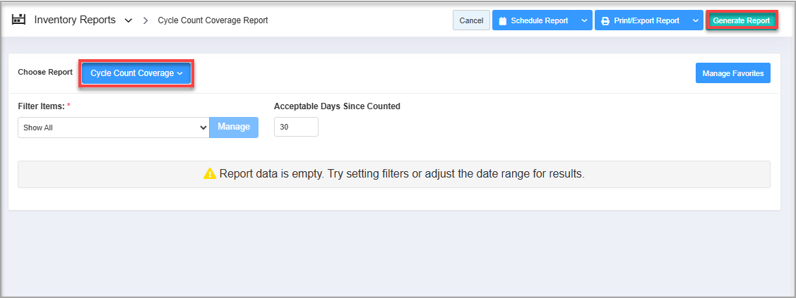 You will see the "Report data is empty" message initially. You need to select at least one location or location group to get the Cycle Count Coverage Report by entering the days that have been counted since.