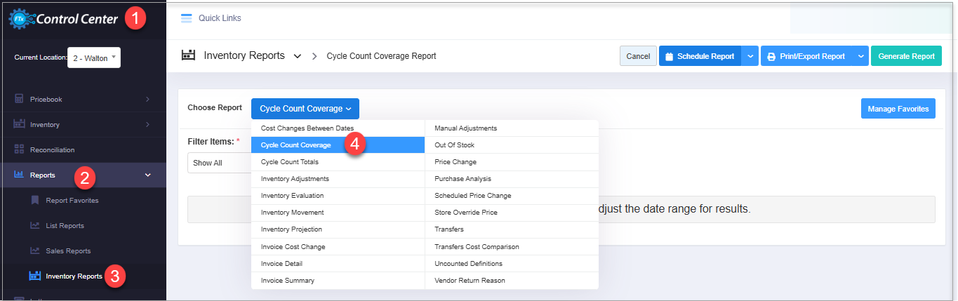 To reach the "Cycle Count Coverage Report," follow the below steps: