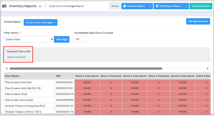 Cycle Count Coverage Report Overview Reports -> Inventory Reports -> "Cycle Count Coverage" The store admin/executive manages the inventory of the store using a POS system handheld device to count the inventory periodically. At the time of counting ...