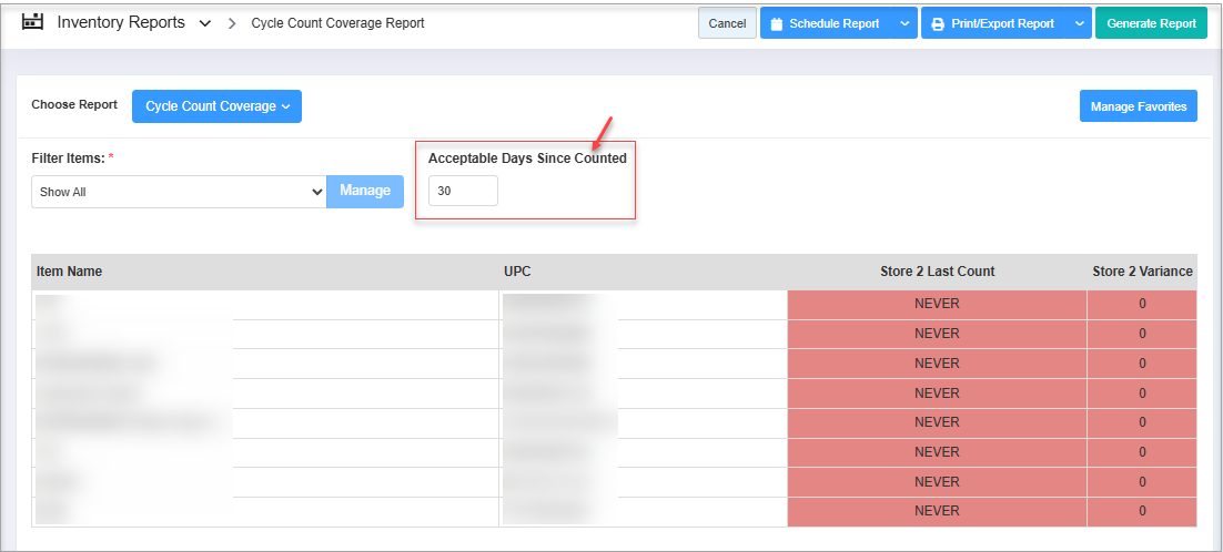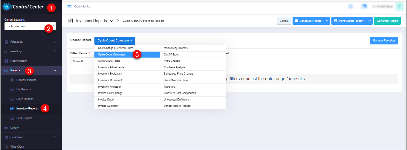 By clicking "Cycle Count Coverage," you will be redirected to the Cycle Count Coverage Report page with relevant filter options.