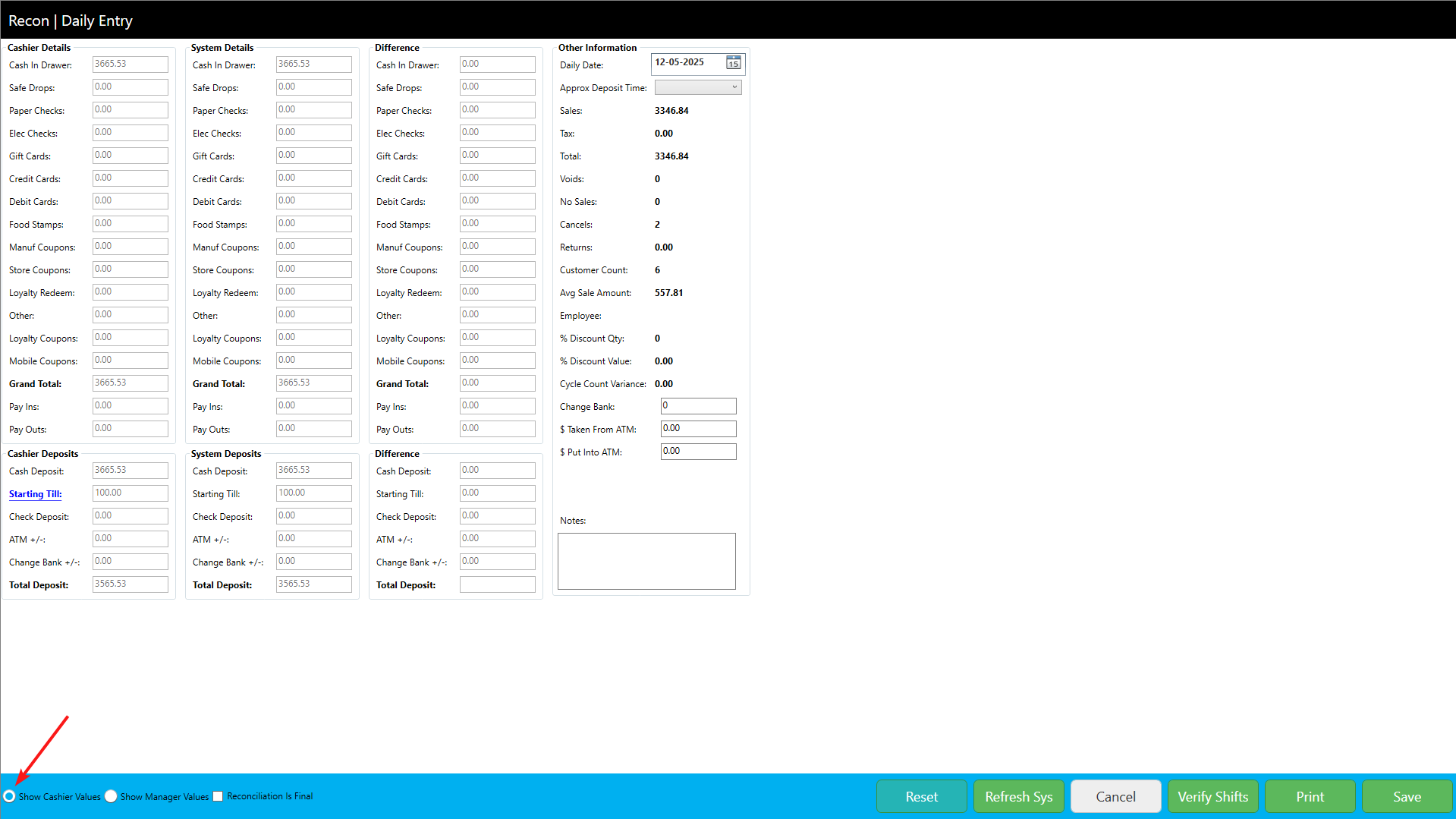 - When all the shift reconciliations are verified, select "Reconciliation Is Final." Once all the values are verified, click the "Save" button to save the Daily Reconciliation.