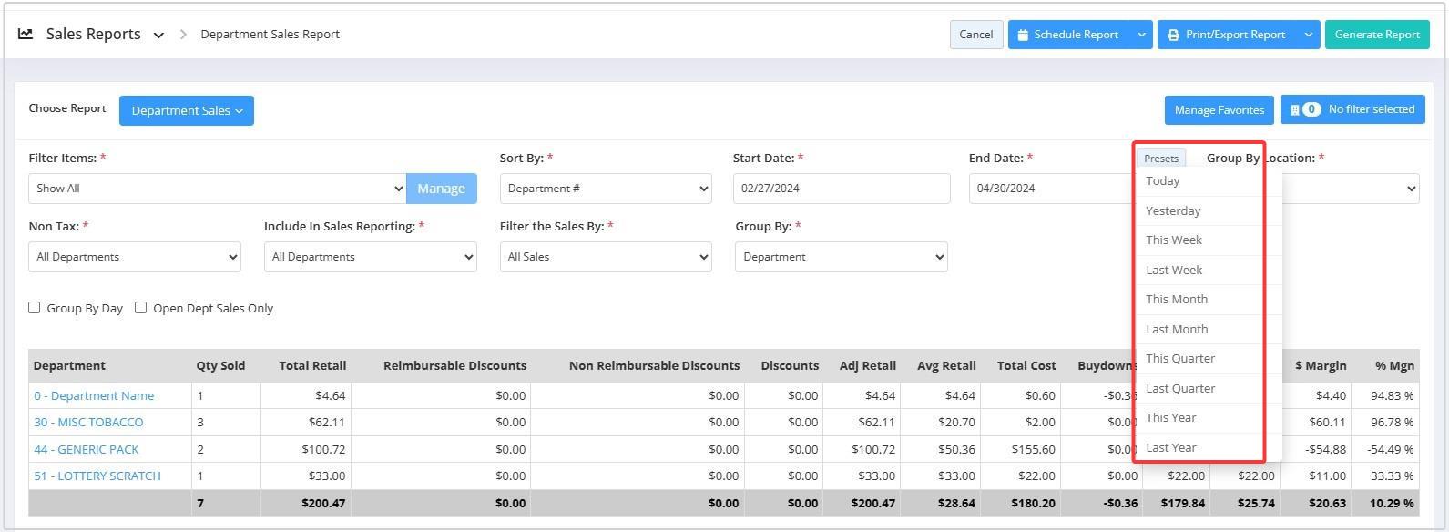 - Select the date range and click "Generate Report" to view the Department Sales Report for the selected date range.