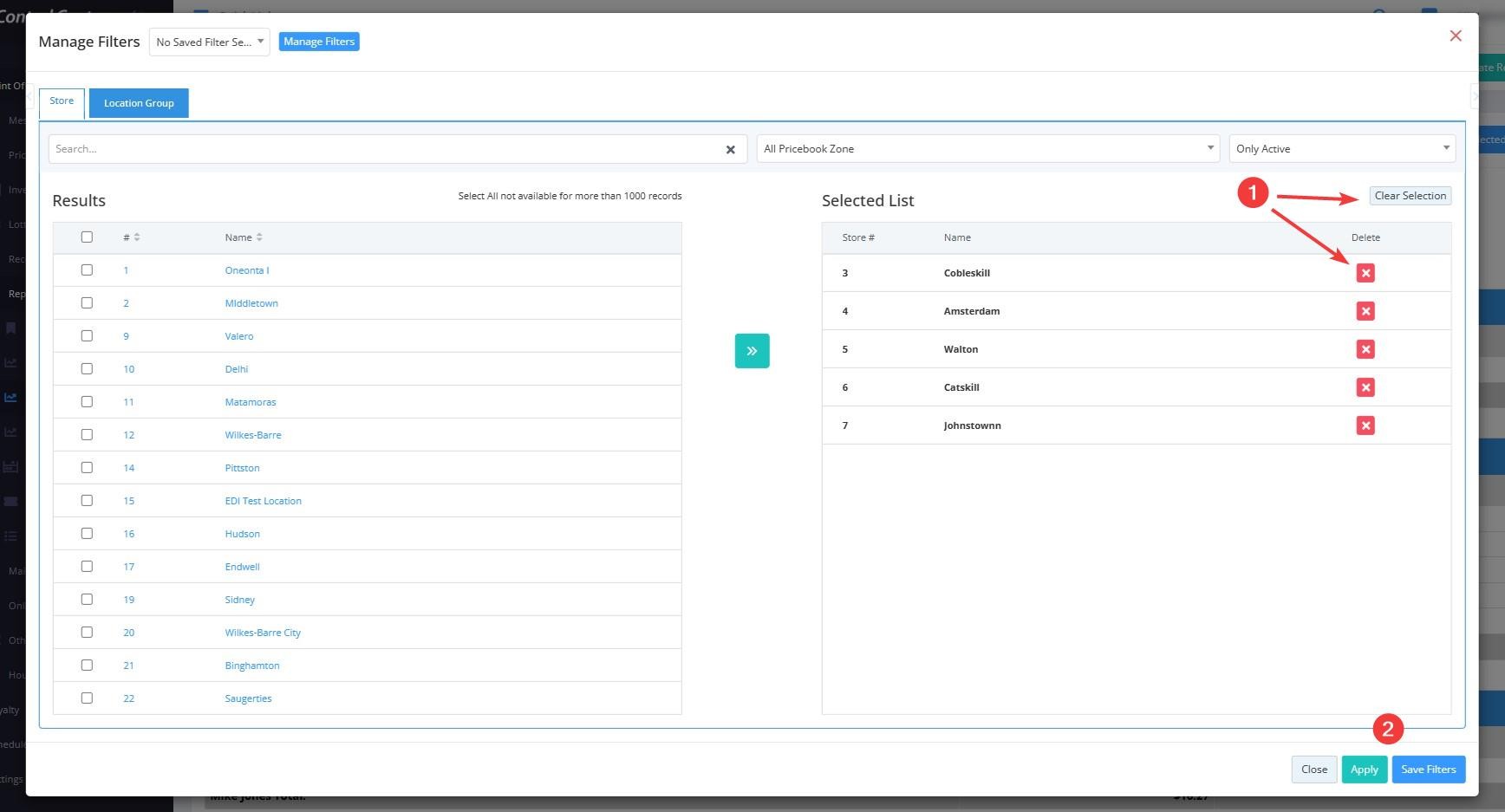 - 4: Use this drop-down to view the results (stores or location groups) based on Pricebook Zone.