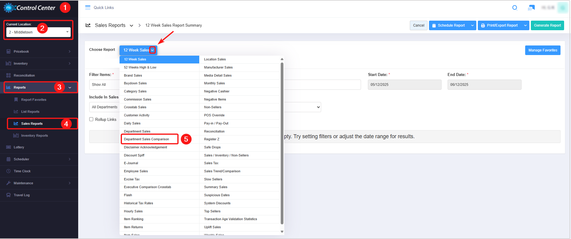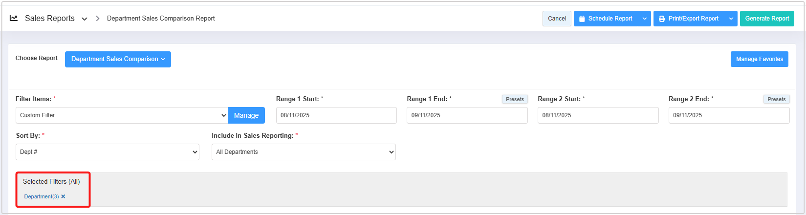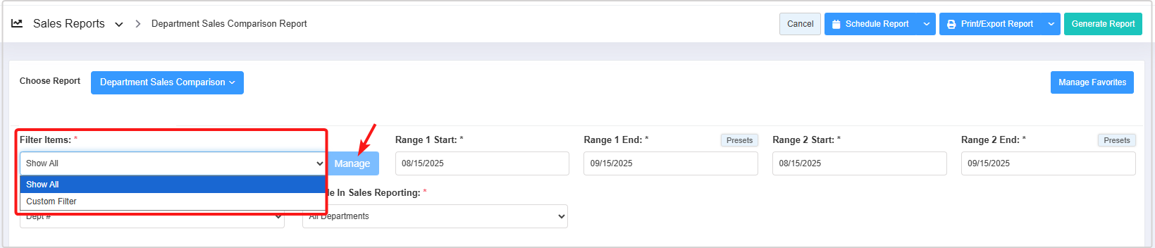 - 1: Saved Filters Drop-Down: Select the saved custom filters from the Manage Filters drop-down (if any) and click "Apply" to apply the saved custom filter. The system will redirect you to the Department Sales Comparison Report home screen. Click "Generate Report" to generate the report for the selected filter.